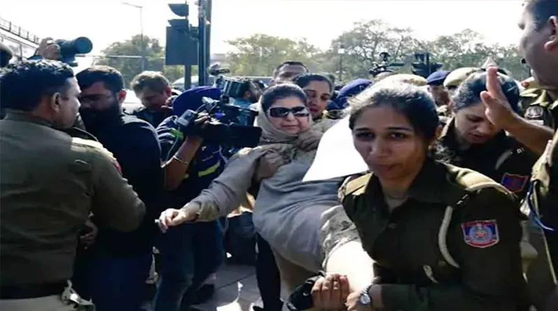 కాగా, అనుమతి లేకుండా ఆందోళనకు పూనుకోవడంతో మెహబూబా ముఫ్తీతో పాటు పలువురు పిడిపి కార్యకర్తలను కూడా ఢిల్లీ పోలీసులు అదుపులోకి తీసుకున్నారు. జమ్ము కశ్మీర్లో గూండా ప్రభుత్వం నడుస్తున్నదని జమ్ము కశ్మీర్ మాజీ ముఖ్యమంత్రి, పీడీపీ నేత మెహబూబా ముఫ్తీ నిరసన వ్యక్తం చేశారు. జమ్ము కశ్మీర్ను ఆఫ్ఘనిస్తాన్లా నాశనం చేస్తున్నారని ఆమె దుయ్యబట్టారు.