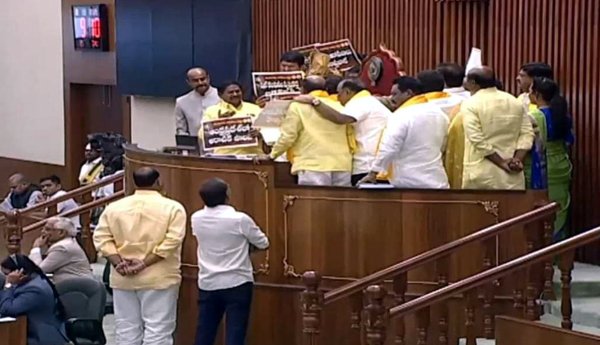 అప్పటికే టిడిపి సభ్యులు పోడియంపైకెళ్లి స్పీకర్ ఛైర్ను చుట్టుముట్టారు. కొద్దిసేపు నినాదాలతో అసెంబ్లీ గందరగోళంగా మారింది. నిరసన వ్యక్తం చేస్తున్న సమయంలోనే టిడిపి సభ్యులు వారి చేతుల్లో ఉన్న కాగితాలు చించి స్పీకర్పై వేశారు.