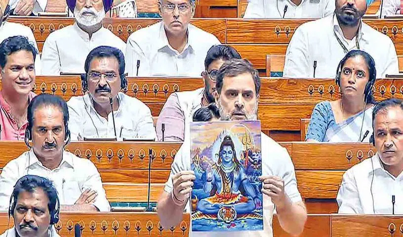 తాను ప్రసంగిస్తున్న వేళ రాహుల్ సభలో కొన్ని మతపరమైన ఫొటోలను రాహుల్ చూపించారు. దీనిపై అధికారపక్షం నుంచి తీవ్ర అభ్యంతరం వ్యక్తమైంది. సభలో ఇలాంటి మతపరమైన ఫొటోల ప్రదర్శనకు నిబంధనలు అంగీకరించవని స్పీకర్ ఓం బిర్లా సూచించారు. చివరకు బీజేపీ ఎంపీల ఫిర్యాదుతో స్పీకర్ రాహుల్ ప్రసంగంలో కొన్ని వ్యాఖ్యలు తొలగిస్తూ నిర్ణయం తీసుకున్నారు.