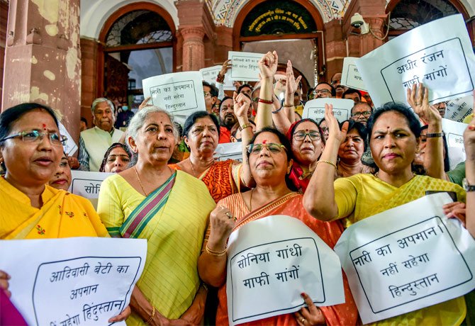 మరో పక్క కరోనా నుంచి కోలుకుని సభకు వచ్చిన ఆర్థిక మంత్రి నిర్మలా సీతారామన్ కూడా తీవ్రంగా స్పందించారు. దీనిపై పార్లమెంట్ ప్రాంగణంలో ధర్నా చేస్తున్న బిజెపి సభ్యులకు ఆమె మద్దతు పలికారు. ‘ఇది ఉద్దేశపూర్వకంగా చేసిన అభ్యంతరకర వ్యాఖ్య. దీనిపై కాంగ్రెస్ అధినేత్రి సోనియాగాంధీ క్షమాపణ చెప్పాలి’ అని ఆమె డిమాండ్ చేశారు.