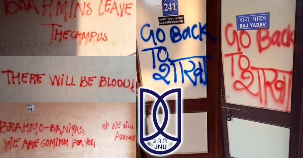 దేశంలోనే ప్రతిష్టాత్మక విద్యాసంస్థలో ఒకటైన ఢిల్లీలోని జవహర్లాల్ నెహ్రూ విశ్వవిద్యాలయంలో మరో వివాదం రాజుకుంది. స్కూల్ ఆఫ్ ఇంటర్నేషనల్ స్టడీస్ భవనంలోని గోడలపై బ్రాహ్మణ, వైశ్య సామాజిక వర్గాలను లక్ష్యంగా చేసుకుని రాసిన విద్వేషపూరిత రాతలు ఉద్రిక్తతలకు దారితీశాయి.