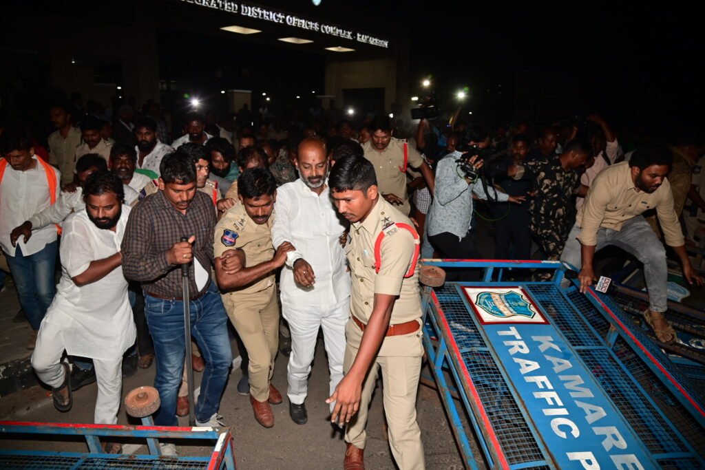 లోపలకు వెళ్లేందుకు ప్రయత్నించగా పోలీసులు అడ్డుకున్నారు. ఇరు వర్గాల మధ్య తోపులాట జరిగింది. పలుమార్లు జరిగిన తోపులాటలో కొంతమంది కార్యకర్తలకు గాయాలయ్యాయి. కొందరు సొమ్మసిల్లి కిందపడిపోయారు. పరిస్థితి ఉద్రిక్తంగా మారడంతో సంజయ్ని పోలీసులు అదుపులోకి తీసుకున్నారు.